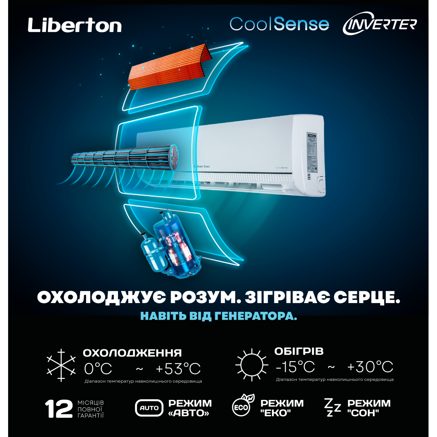 режими: авто, "сон", "еко"; клас енергспоживання: A+; матеріал корпусу внутрішнього блоку: первинний пластик; пульт