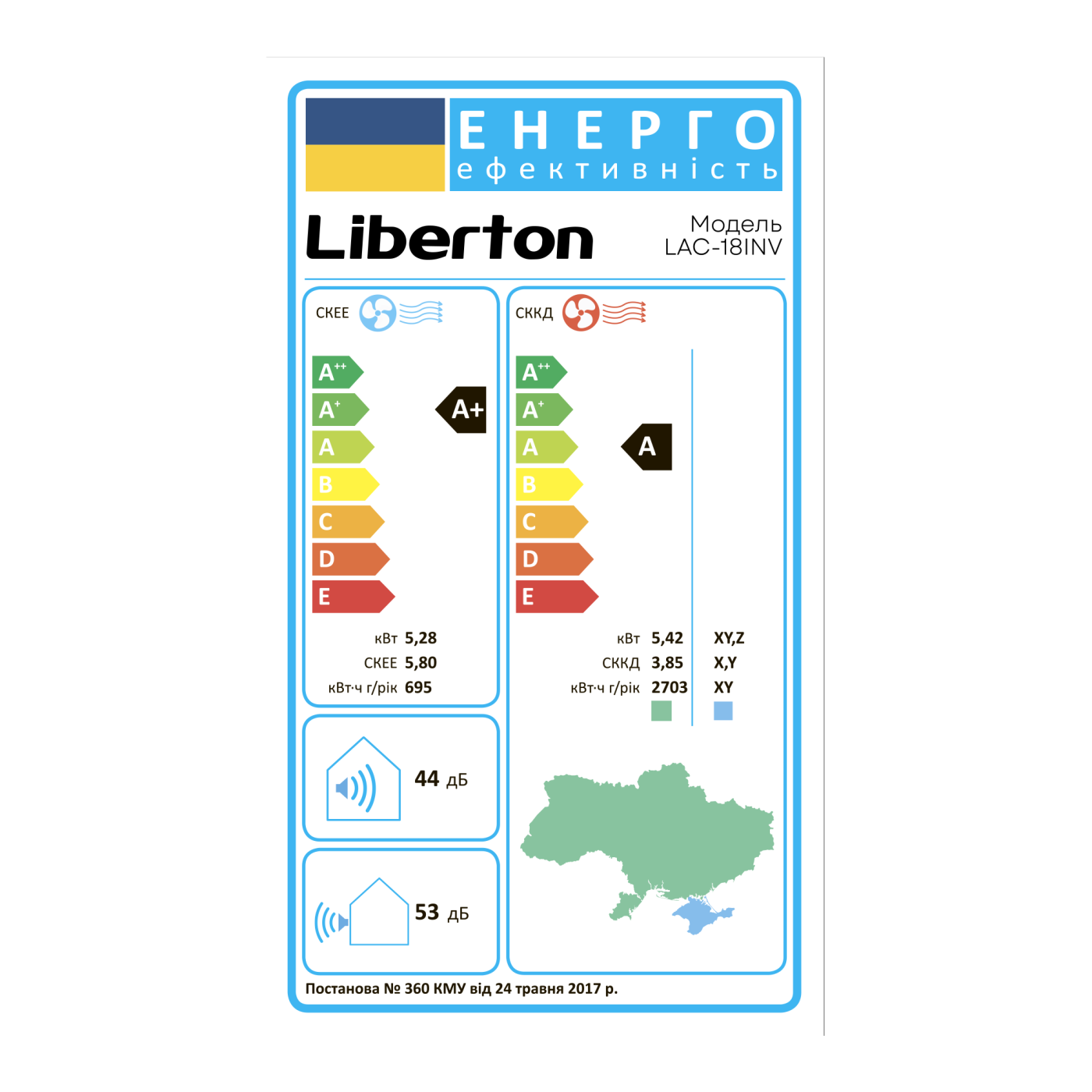 Тип: спліт-система; Компресор, тип: інверторний; Площа охолодження/обігріву: 60 м2; Потужність охолодження/обігріву: 5280/5420 Вт; Споживана потужність: 1645/1500 Вт; Режими: авто, сон, еко, осушення повітря, вентиляція; Таймер: 24 год.; Прихований дисплей; Антибактеріальний фільтр; Холодоагент: R32; Колір: білий.