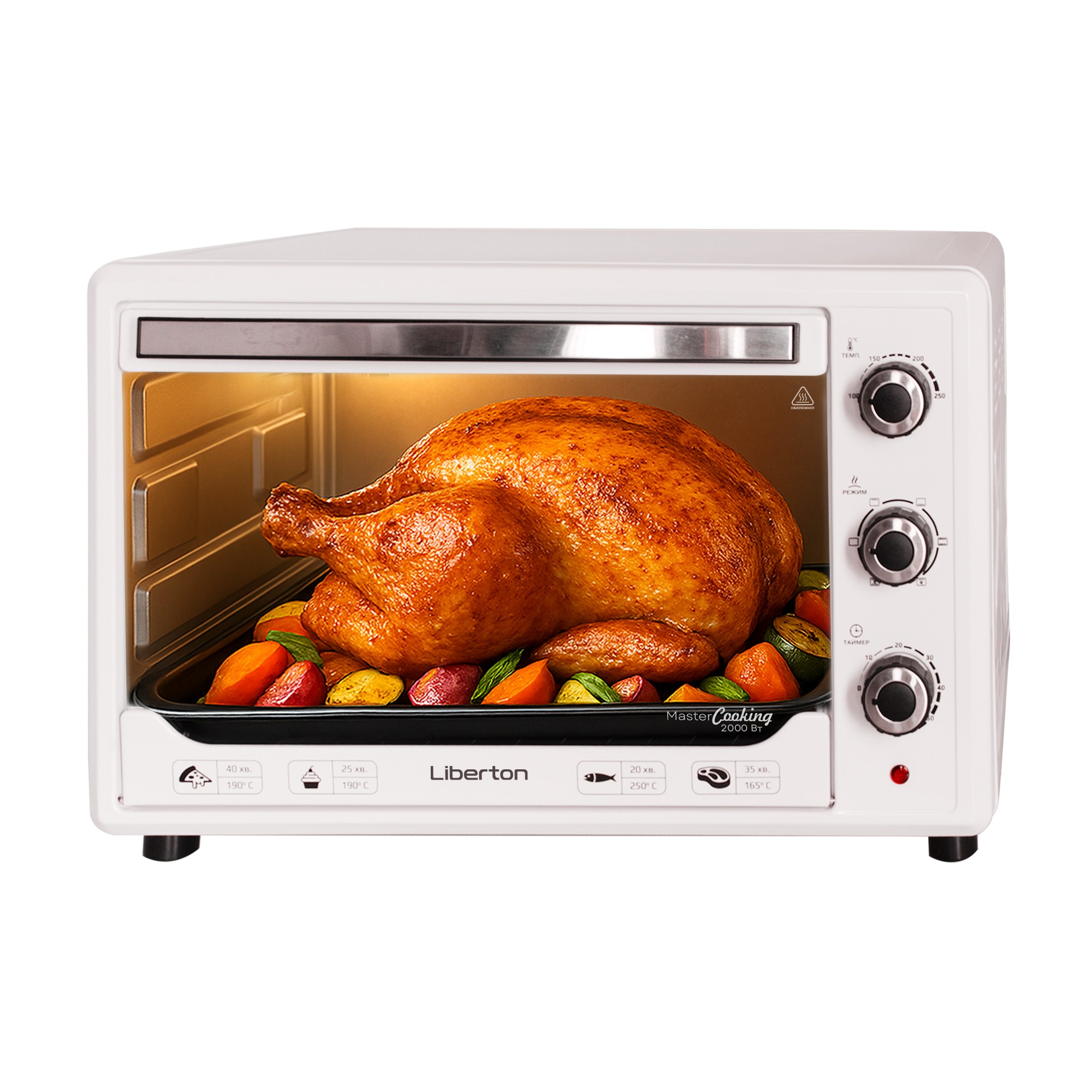 Об'єм: 48 л; Висота внутрішньої камери: 30 см; Потужність: 2000 Вт; Термостат: 250 град.; Комплектація: решітка, прямокутне деко, тримач для дека; Скло в дверцятах: 1; Режими приготування: 5; Конвекція; Підсвітка; Управління: механічне; Внутрішнє покриття: цинкове; Розмір виробу: 54,9x40,8x37,7 см; Колір: білий.