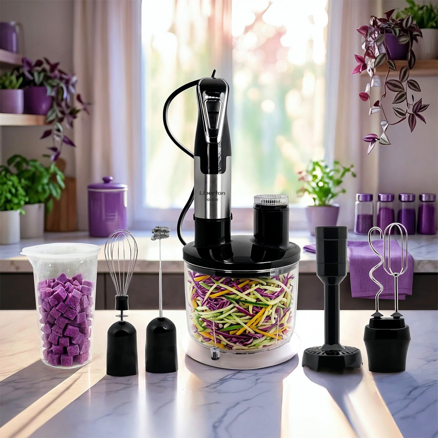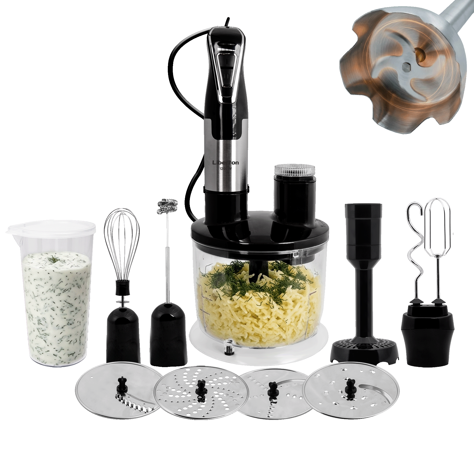Потужність: 1200 Вт; Тип: занурювальний; Кількість швидкостей: 2; Плавне регулювання: так; Турборежим: так; Комплектація: 11 в 1; Аксесуари: насадка "блендер", вінчик для збивання, мірний стакан (600 мл), чаша подрібнювача (1750 мл), диск для крупної нарізки, диск для дрібної нарізки, диск для соломки, диск-терка, насадка-міксер, гак для тіста, насадка для пюре; Ніж: нержавіюча сталь; Матеріал корпусу: пластик; Колір: чорний+нерж.