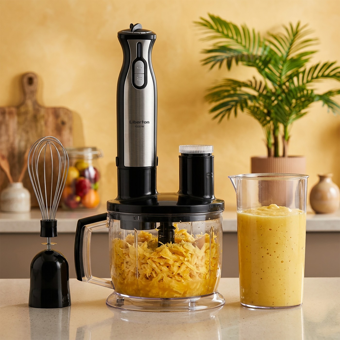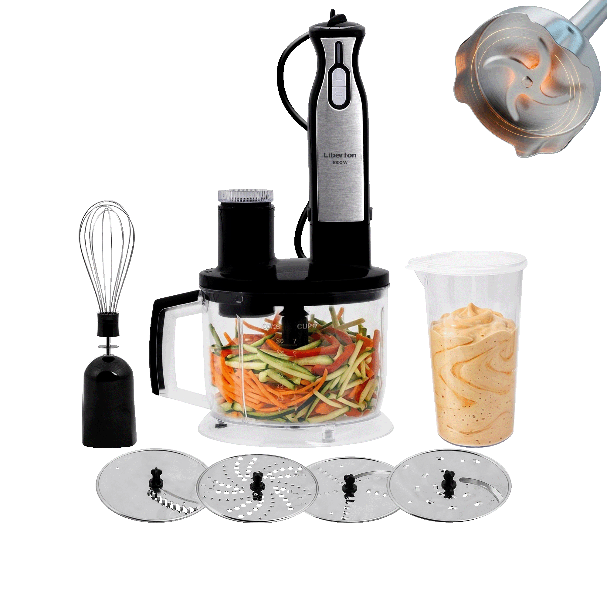 Потужність: 1000 Вт; Тип: занурювальний; Кількість швидкостей: 2; Плавне регулювання: так; Турборежим: так; Комплектація: 8 в 1; Аксесуари: насадка "блендер", вінчик для збивання, мірний стакан (600 мл), чаша подрібнювача (1750 мл), диск для крупної нарізки, диск для дрібної нарізки, диск для соломки, диск-терка; Ніж: нержавіюча сталь; Матеріал корпусу: пластик; Колір: чорний+нерж.
