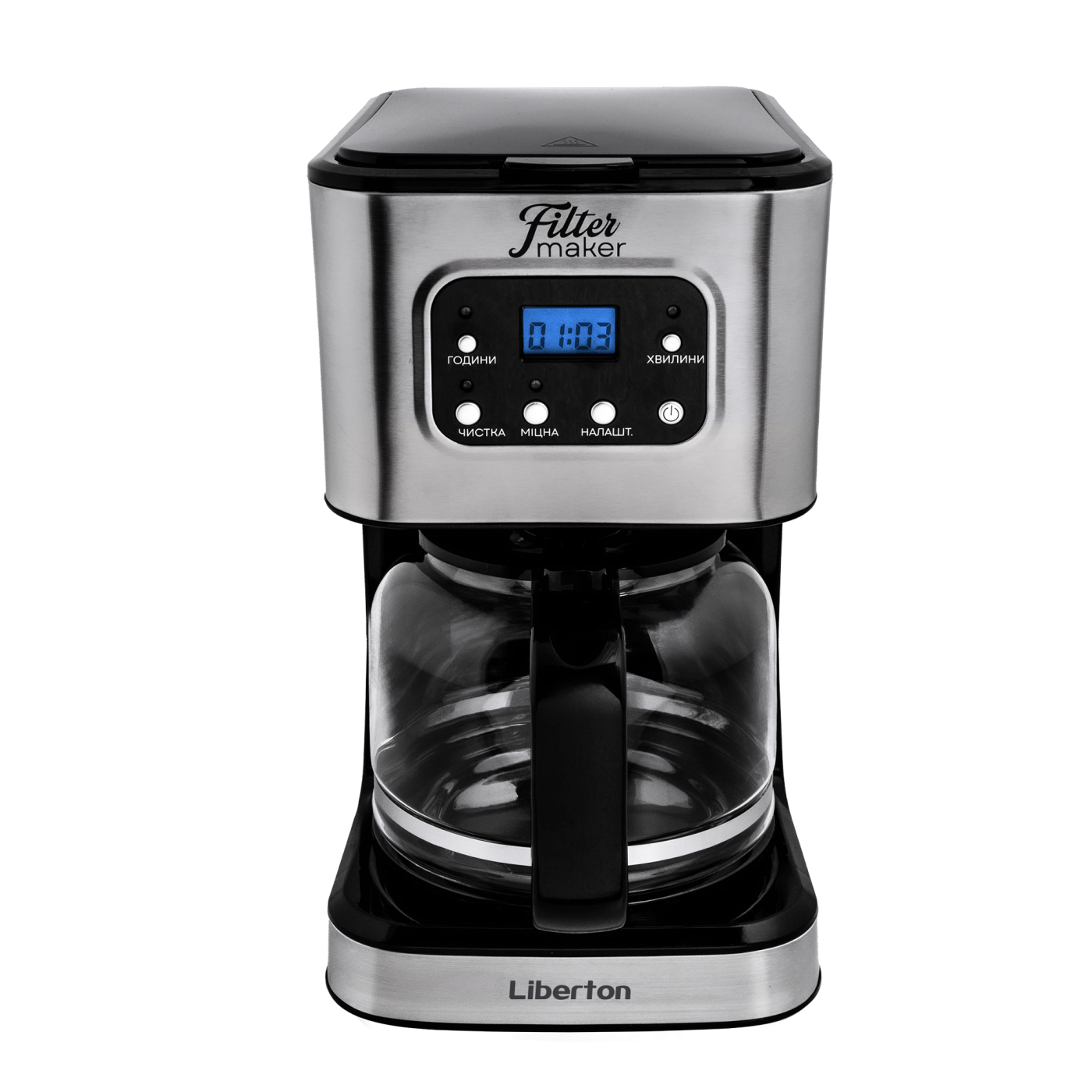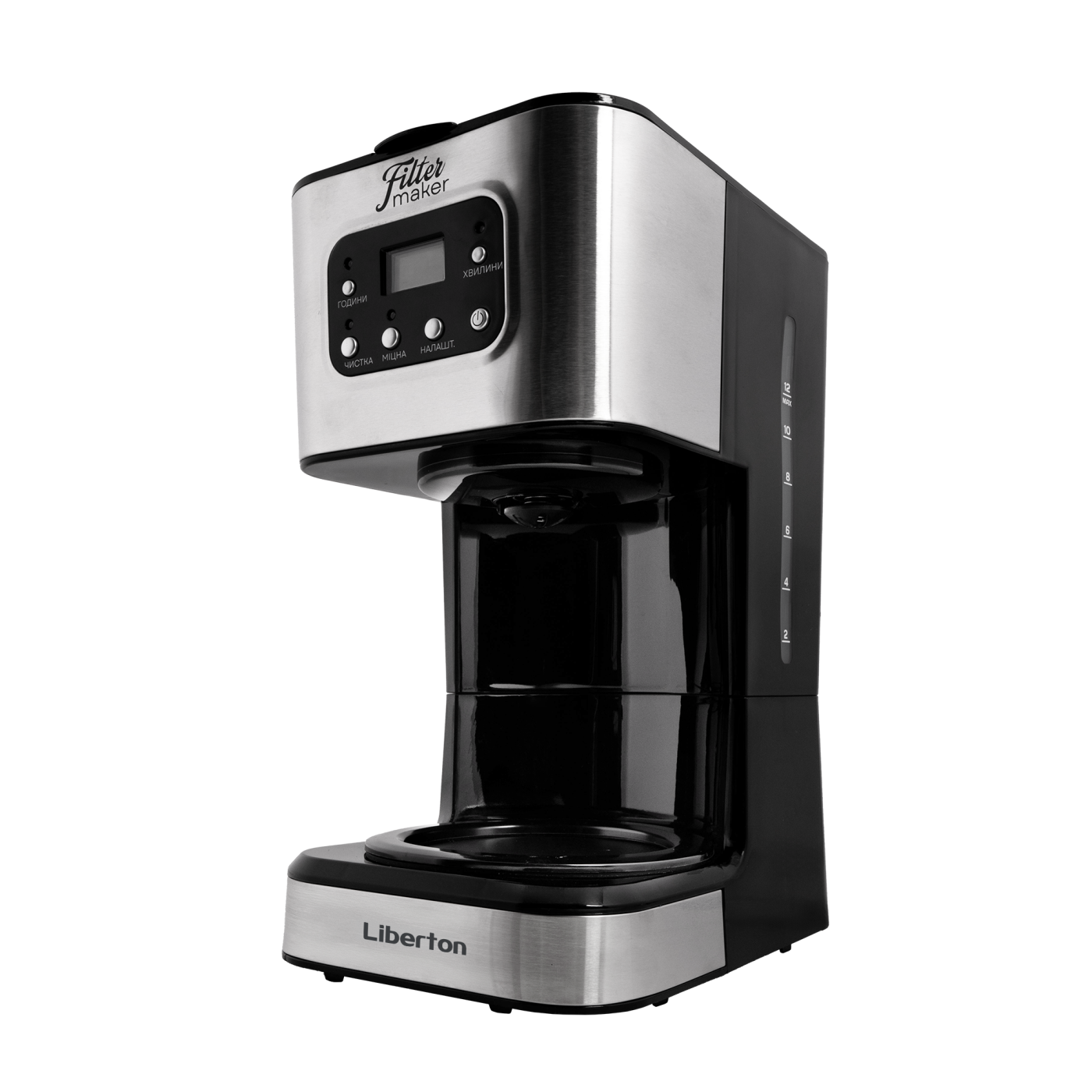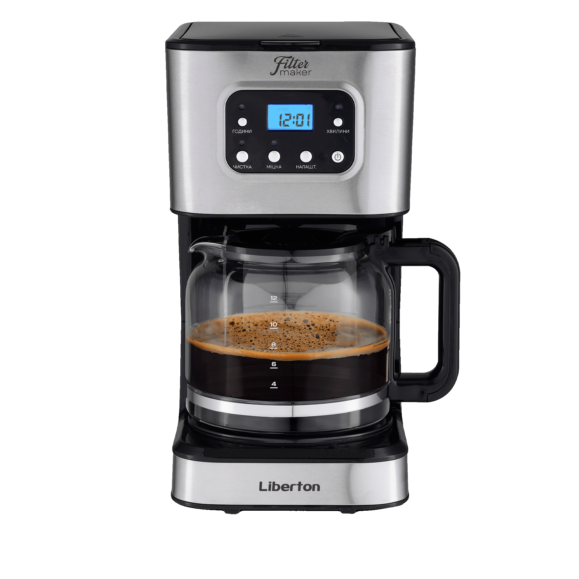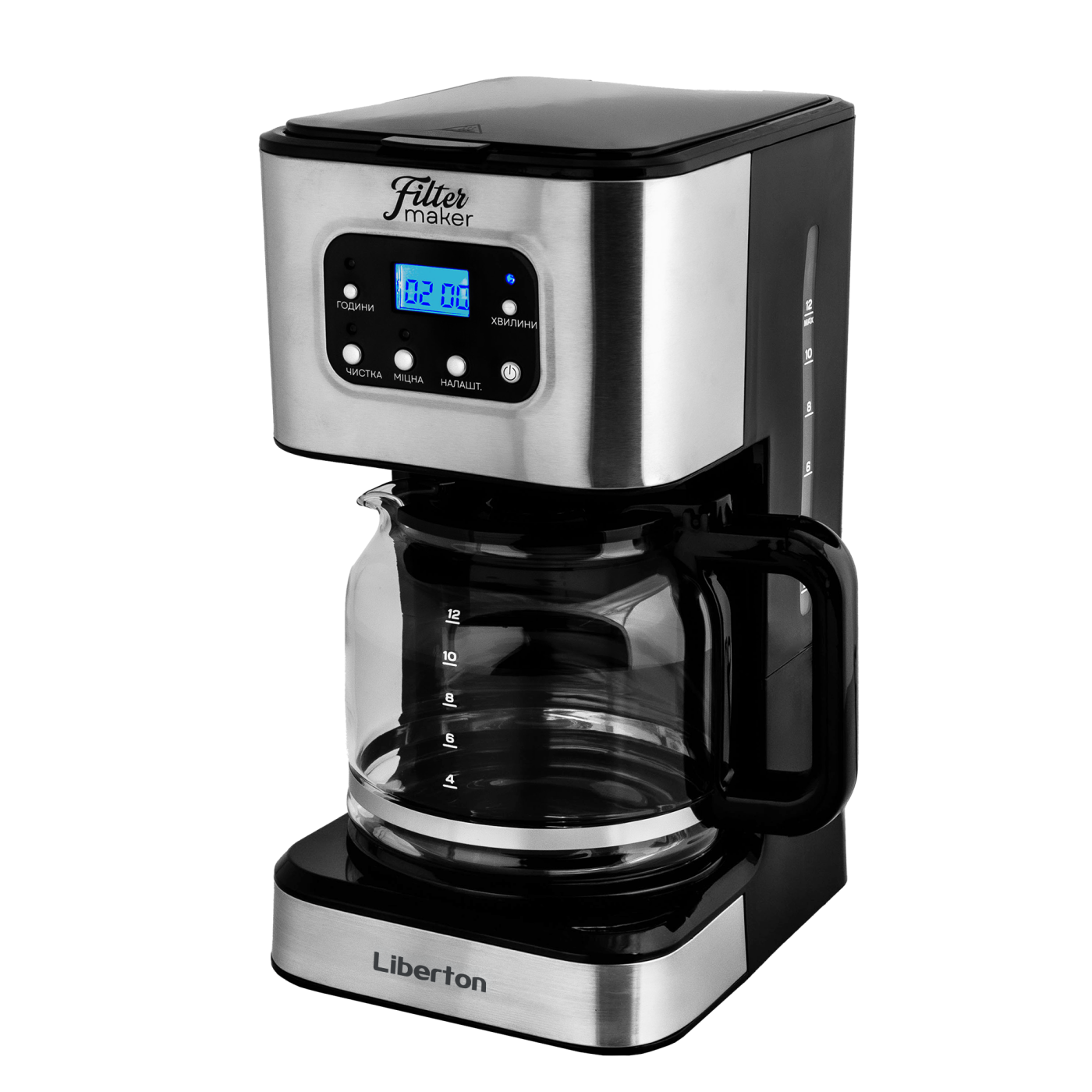Тип кавоварки: крапельна; Потужність: 950 Вт; Тип управління: електронне; Ємність резервуара для води: 1,5 л; Кількість чашок готового напою: 12 шт.; Тип кави: мелена; Тип фільтра: багаторазовий; Особливості: регулювання міцності кави, автоматична підтримка температури, підігрівання кавника, автоматичне відключення, програма очистки, протикрапельна система, дисплей, годинник, таймер (24 години), захист від перегріву, індикатор увімкнення, індикатор рівня води, мірна ложка; Матеріал корпусу: пластик+нержавіюча сталь; Матеріал кавника: високотемпературне скло; Розмір виробу: 16,8х32,3х23 см; Колір: чорний+срібло.