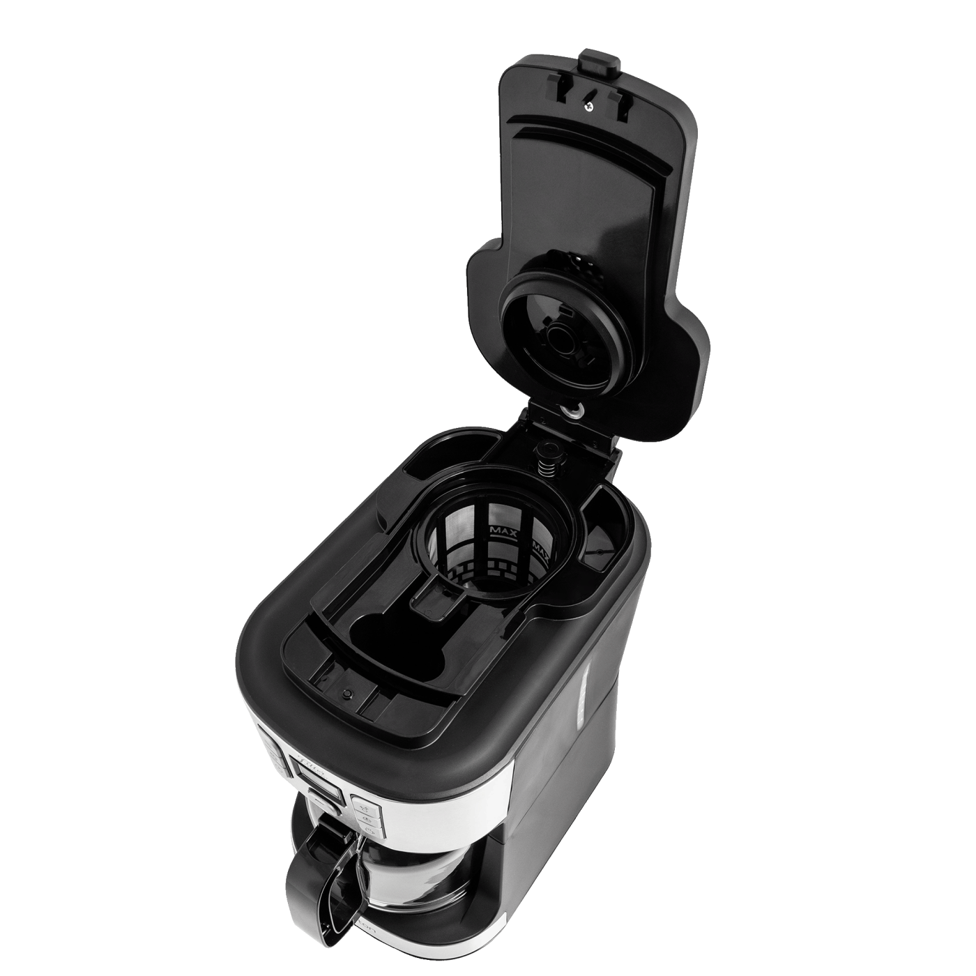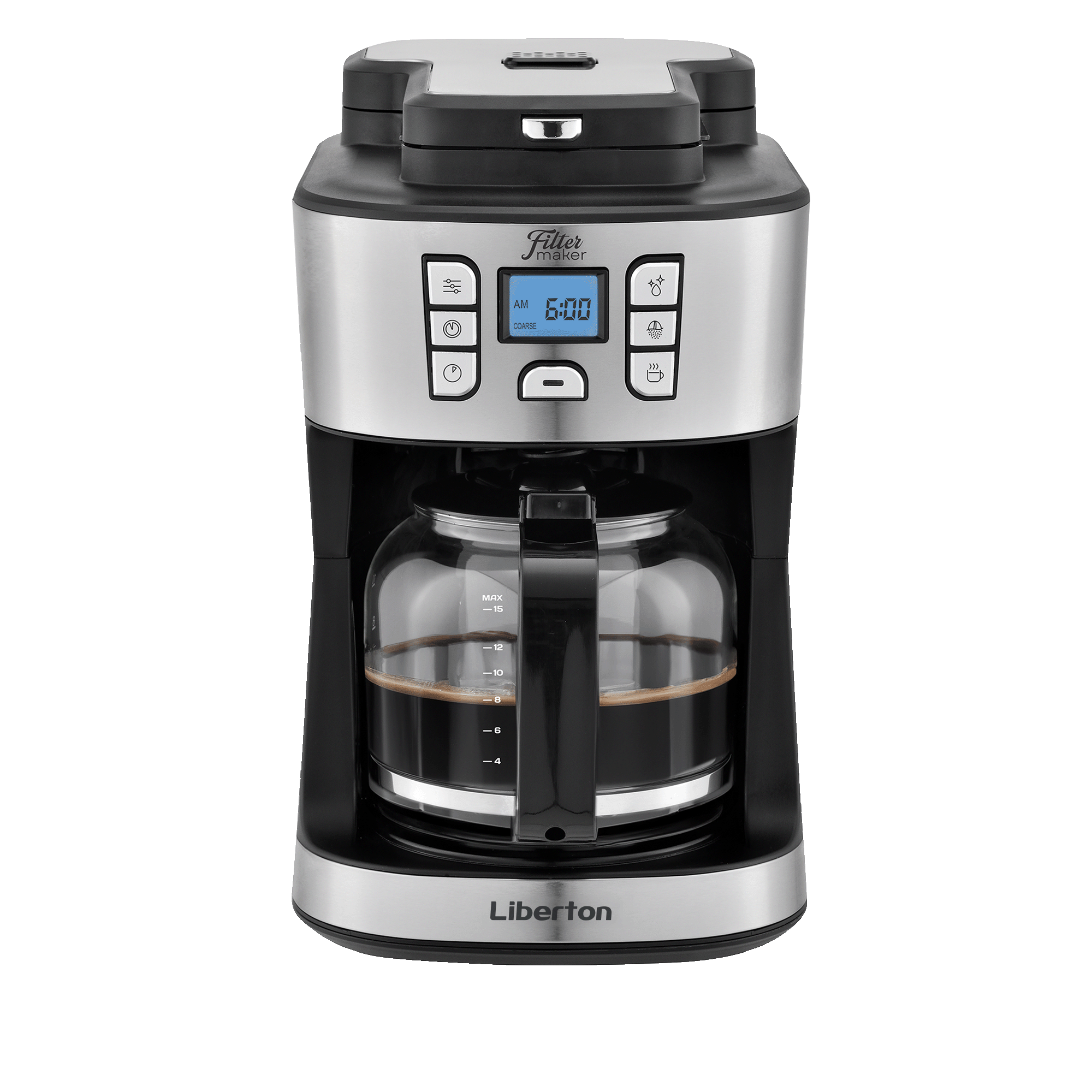 Тип кавоварки: крапельна; Потужність: 950 Вт; Тип управління: електронне; Ємність резервуара для води: 1,8 л; Кількість чашок готового напою: 15 шт.; Тип кави: зернова, мелена; Місткість кавових зерен: 84 г; Тип фільтра: багаторазовий; Особливості: вбудована кавомолка, регулювання міцності кави, автоматична підтримка температури, підігрівання кавника, автоматичне відключення, програма очистки, протикрапельна система, дисплей, годинник, таймер (24 години), захист від перегріву, індикатор увімкнення, індикатор рівня води, мірна ложка; Матеріал корпусу: пластик+нержавіюча сталь; Матеріал кавника: високотемпературне скло; Розмір виробу: 20,5х35,3х25 см; Колір: чорний+срібло.