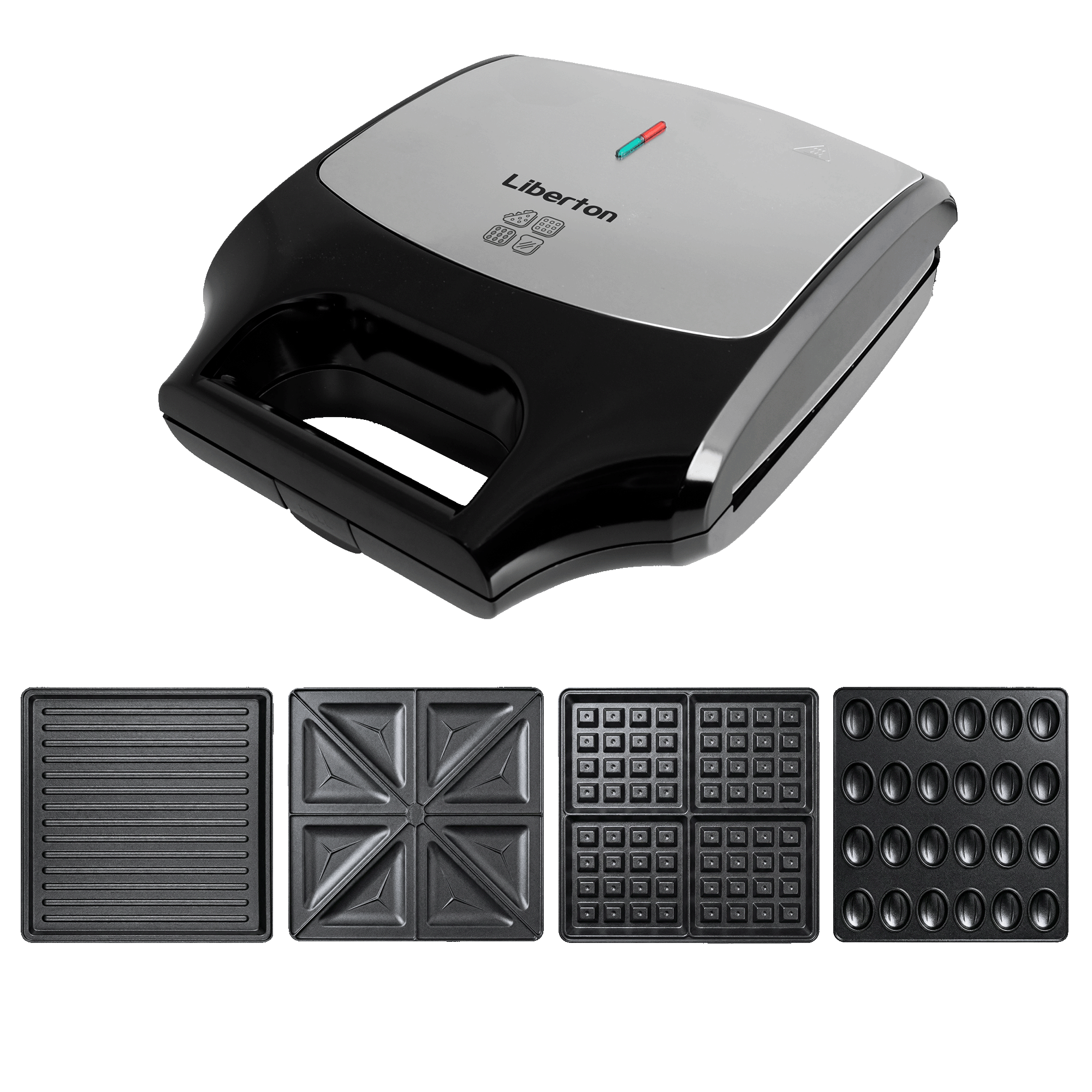 Потужність: 1400 Вт; 4 в 1; Пластина: гриль, бельгійські вафлі (4 шт.), трикутні сендвічі (8 шт.), горішниця (24 шт.); Індикатор живлення і готовності їжі; Автоконтроль температури; Покриття пластин: антипригарне; Розмір робочої поверхні: 25,4х21,5 см; Матеріал корпусу: бакеліт+нержавіюча сталь; Розмір виробу: 31,9х11х26,1 см; Колір: чорний+нерж.